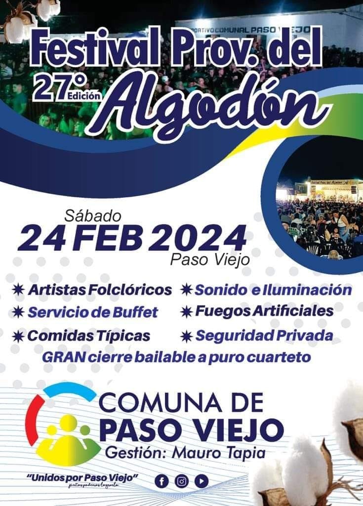 Nota con el presidente comunal  de Paso Viejo Mauro Tapia que invita a la 27 edición del Festival provincial del Algodón a realizarse este sábado 24 de Febrero con la presentación de grandes artistas y entrada gratis.