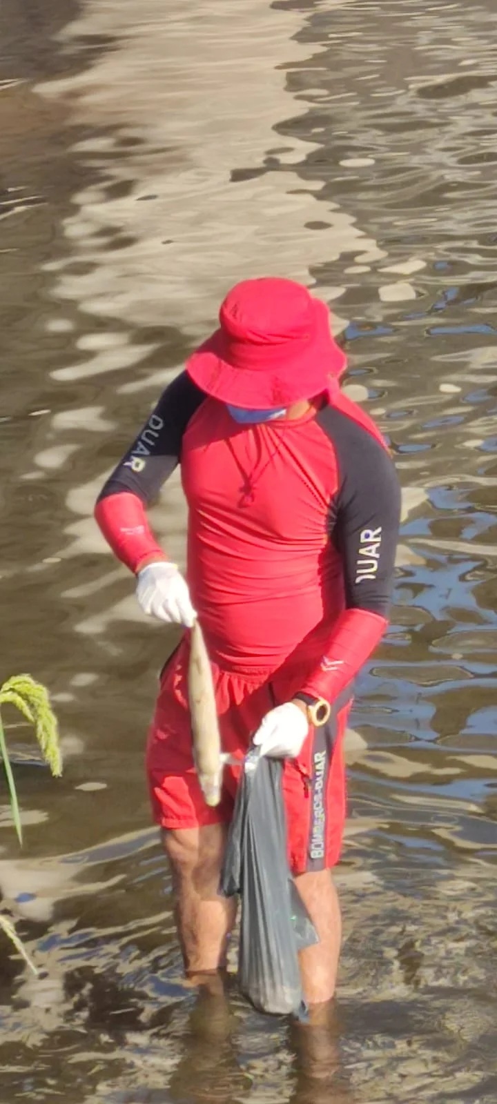 En una jornada marcada por la preocupación ambiental, el personal del Departamento Unidades de Alto Riesgo (DUAR) se unió a las labores de evaluación y recolección de peces muertos en el Dique Arturo Illia, ubicado en Cruz Del Eje.