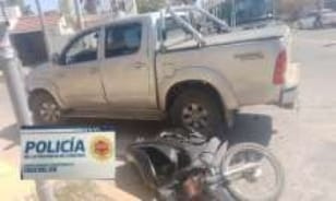 EN CALLE EVA PERÓN Y DEAN FUNES, SE CONSTATA UN ACCIDENTE DE TRANSITO ENTRE UNA CAMIONETA MARCA TOYOTA HILUX CONDUCIDO POR UN HOMBRE MAYOR DE EDAD Y UNA MOTOCICLETA MARCA BRAVA NEVADA 110 CC, CONDUCIDA POR UNA MUJER , ESTA ULTIMA RESULTA LESIONADA CON POLITRAUMATISMOS Y ES TRASLADADA HACIA EL HOSPITAL AURELIO CRESPO.