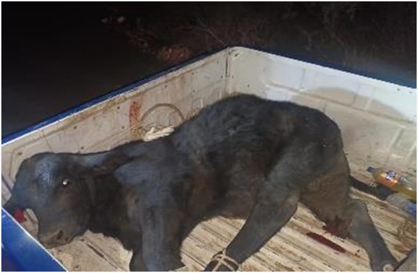 FORD KA, ACOMPAÑADA POR TRES PERSONAS DE SU MISMO SEXO, TODAS CON DOMICILIO EN VILLA DE SOTO, DONDE EN LA ALTURA MENCIONADA COLISIONAN CON UN ANIMAL VACUNO DE PELAJE NEGRO, SIN MARCA DE FUEGO VISIBLE NI SEÑAL, AMBULANCIA DE SAN MARCOS INTERVIENE A LAS MUJERES ENCONTRÁNDOSE EN BUEN ESTADO DE SALUD, PROCEDIENDO A POSTERIOR AL SECUESTRO DEL ANIMAL