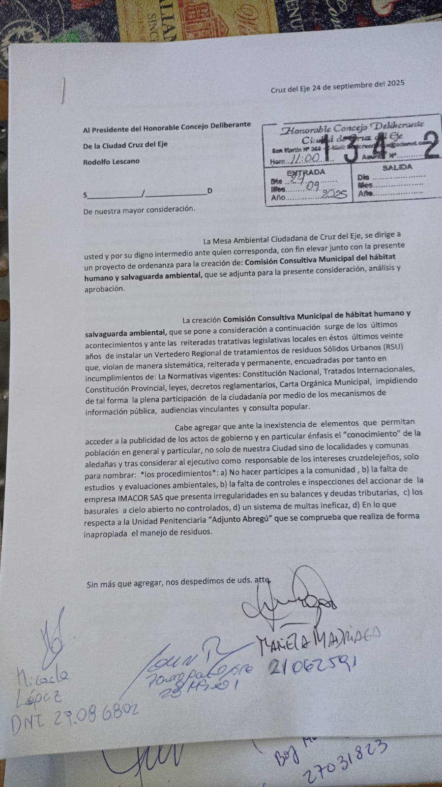 Cruz del Eje. – La Mesa Ambiental Ciudadana junto a vecinos autoconvocados presentaron este 24 de septiembre en el Honorable Concejo Deliberante un proyecto de ordenanza que propone la creación de la Comisión Consultiva Municipal de Hábitat Humano y Salvaguarda Ambiental, un organismo participativo destinado a fortalecer el cuidado del ambiente y garantizar la transparencia en las decisiones públicas relacionadas con la temática.